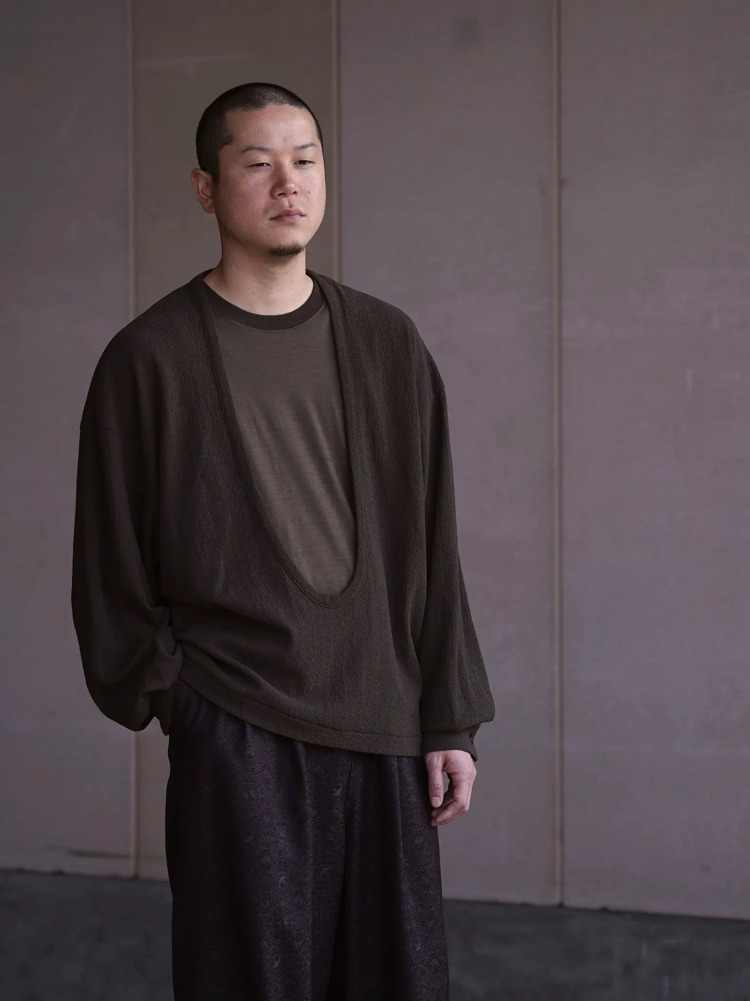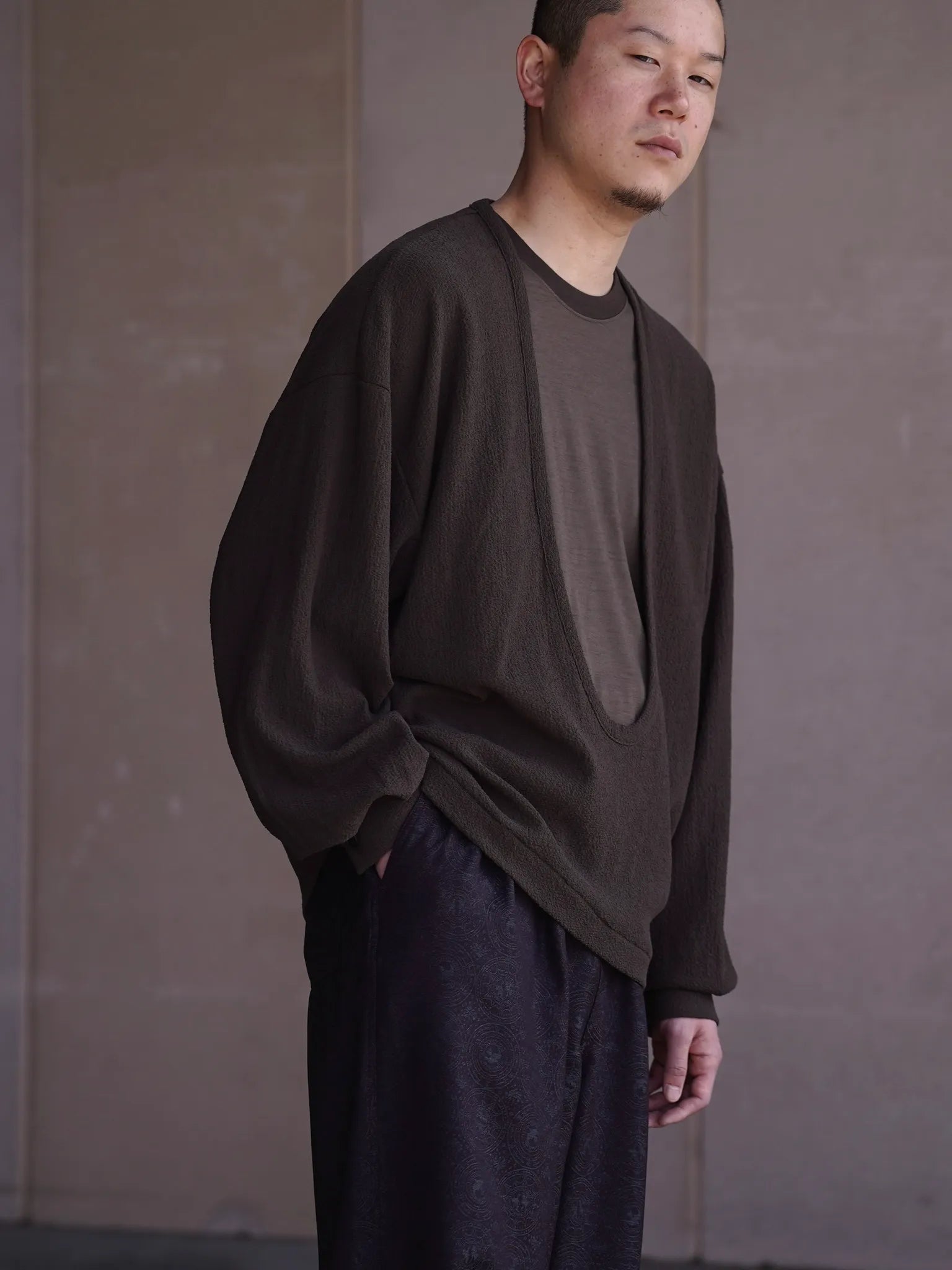 nonnotte Drape U Pullover with Cuff Sleeve Khaki